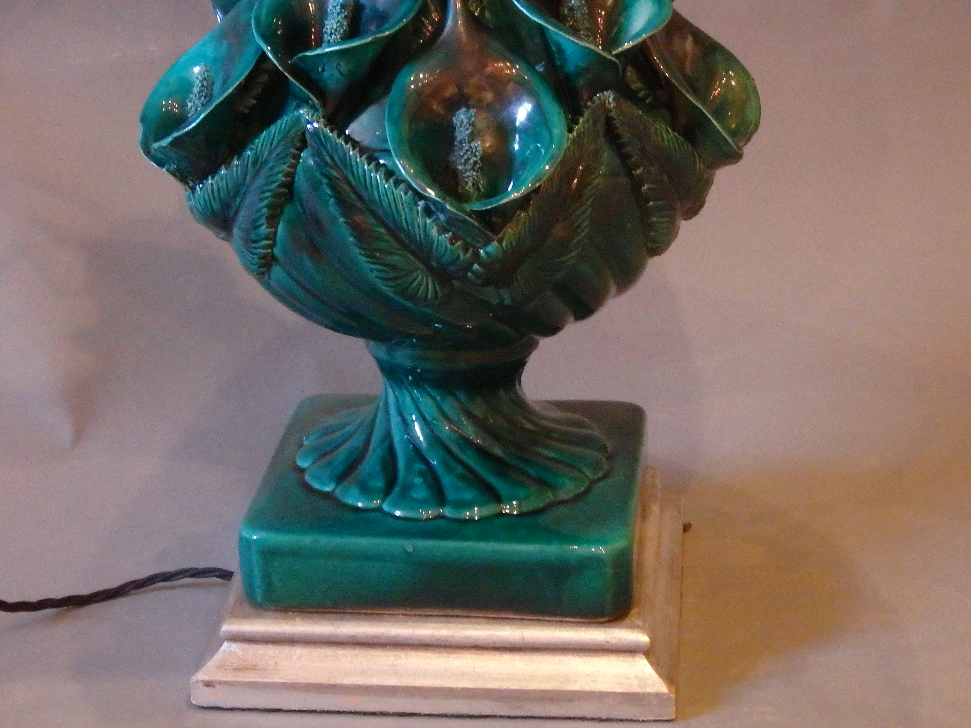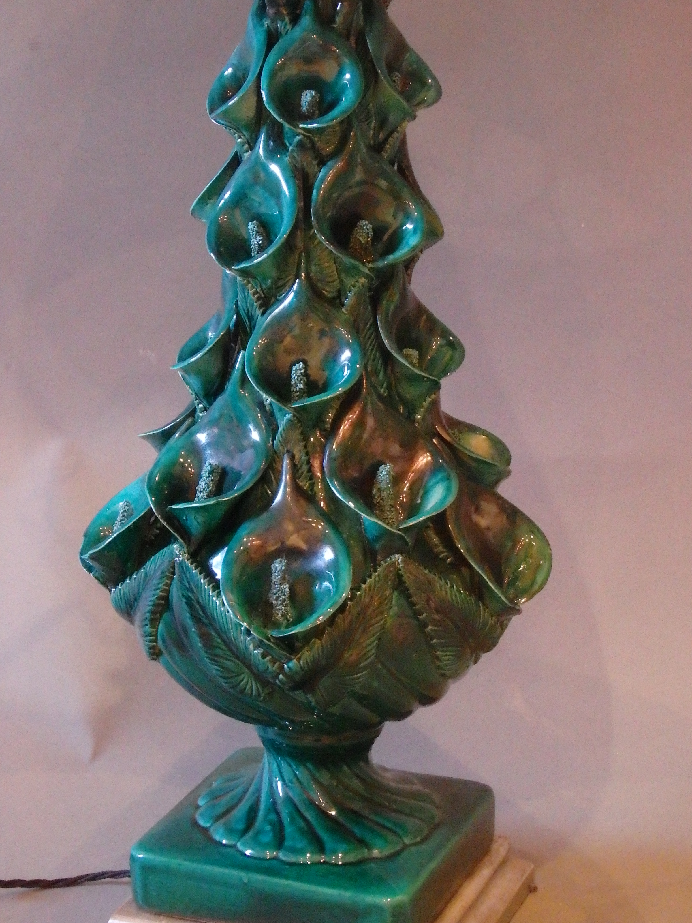 A Large Dark Green Ceramic Lamp by Casa Pupo, London, Mid 20thC, Decorated all over with Calla Lillies and standing on a silvered base.