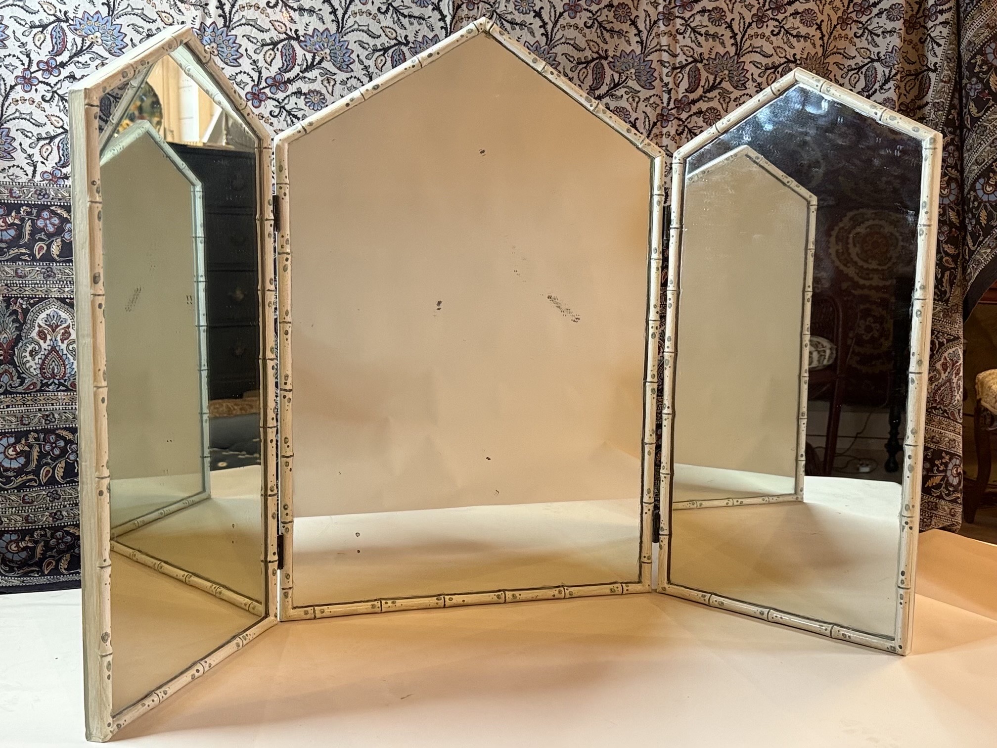 A Lovely Large Painted Faux Bamboo Triptych Dressing Table Mirror, English, Mid 20th Century