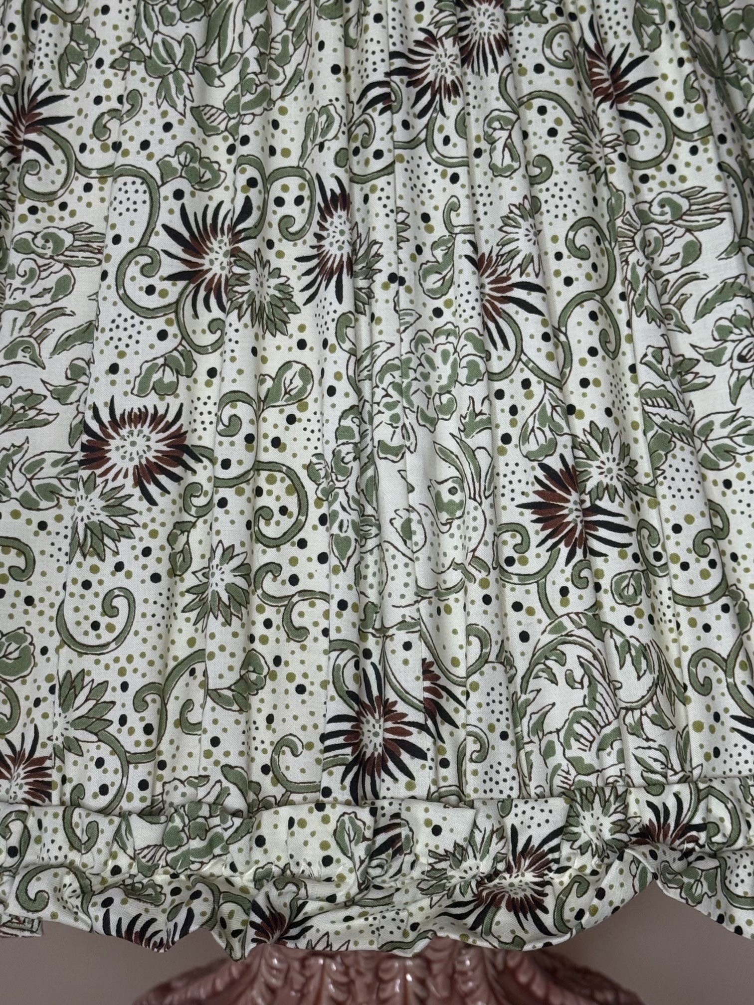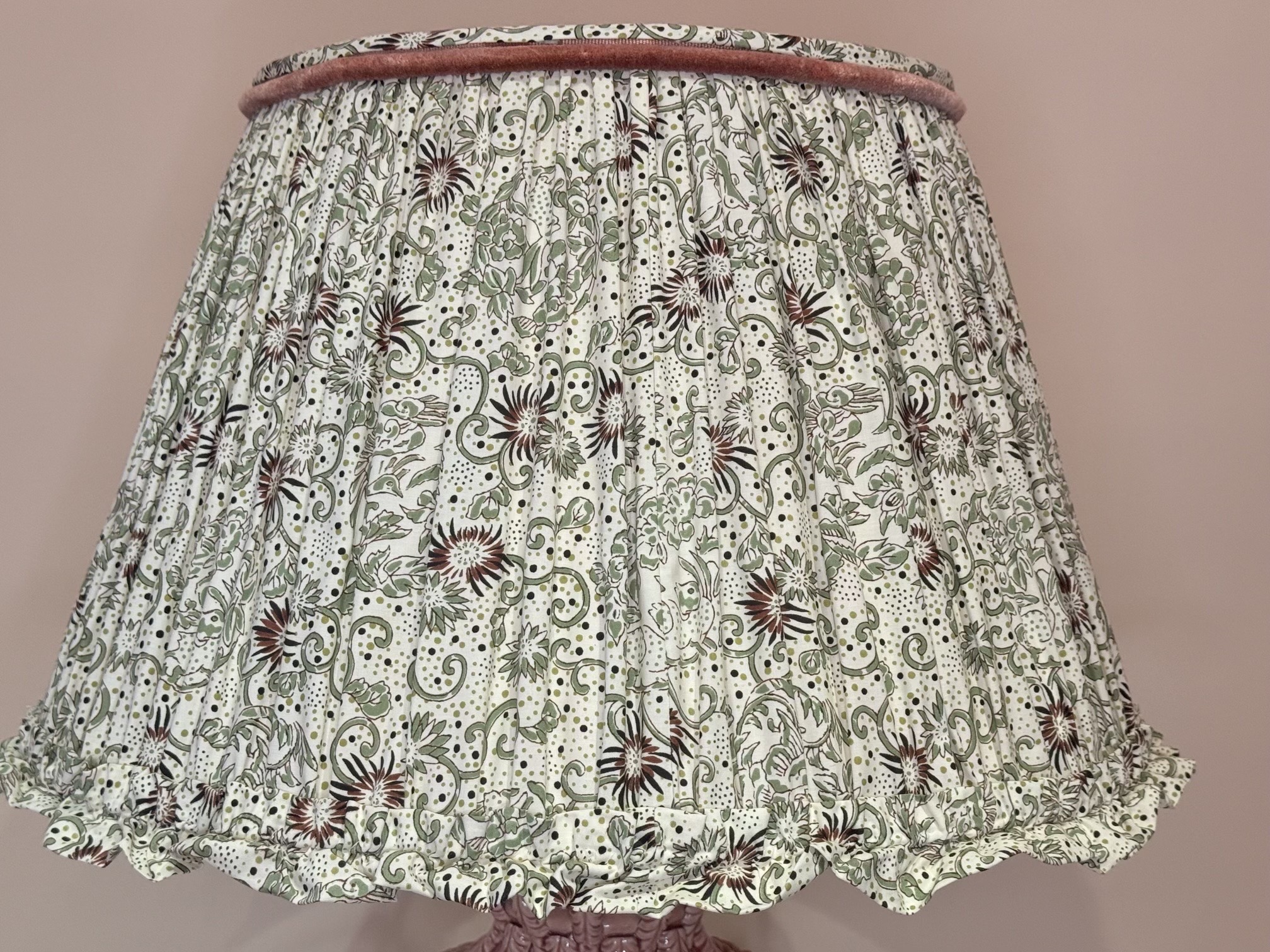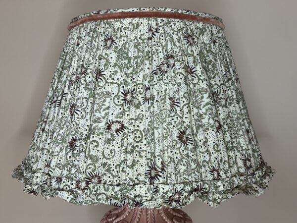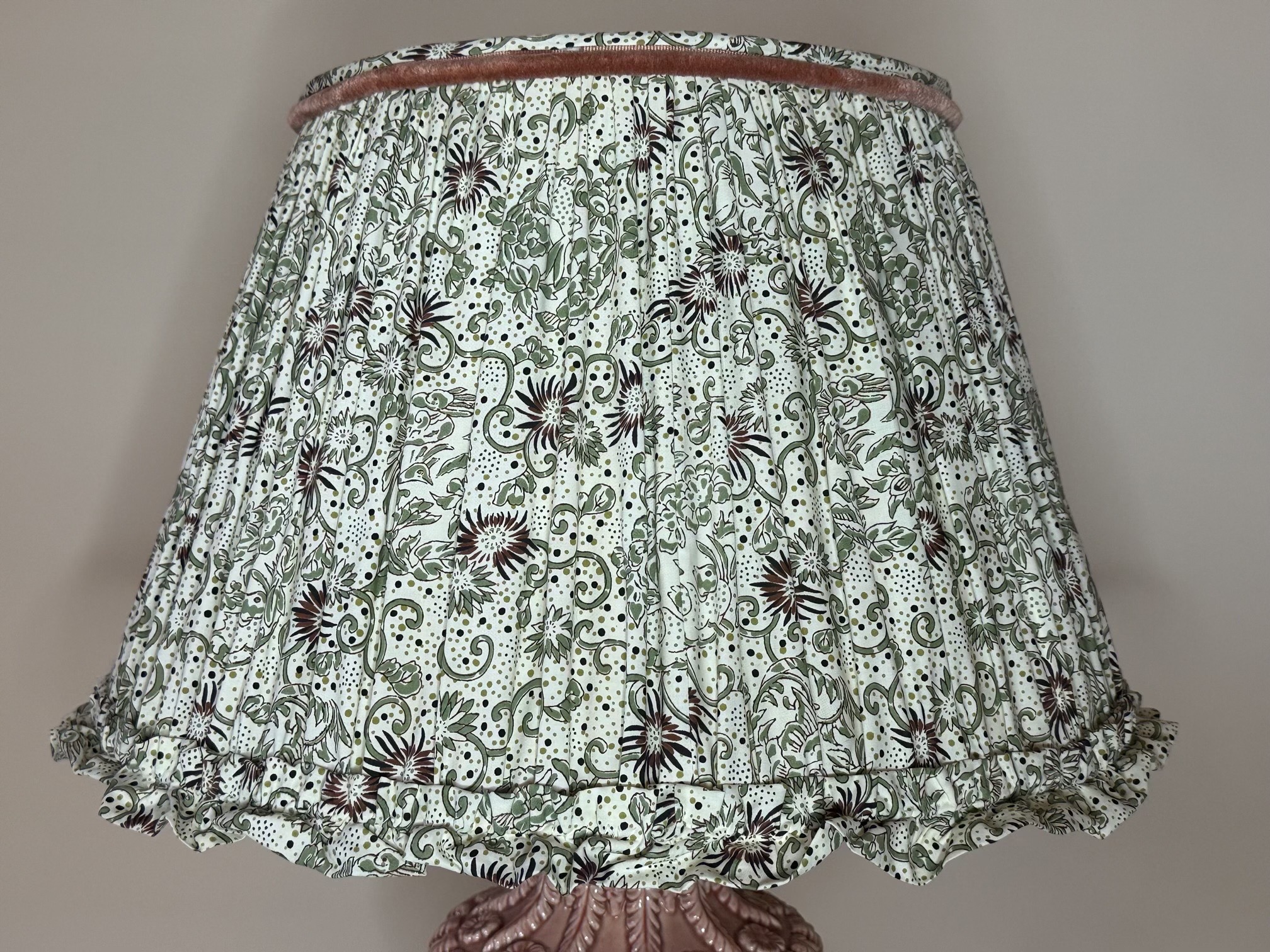 A Lovely Large Gathered Lampshade in Le Manach Fabric (by Pierre Frey) with Frill and Pale Terracotta Velvet to Top Rim