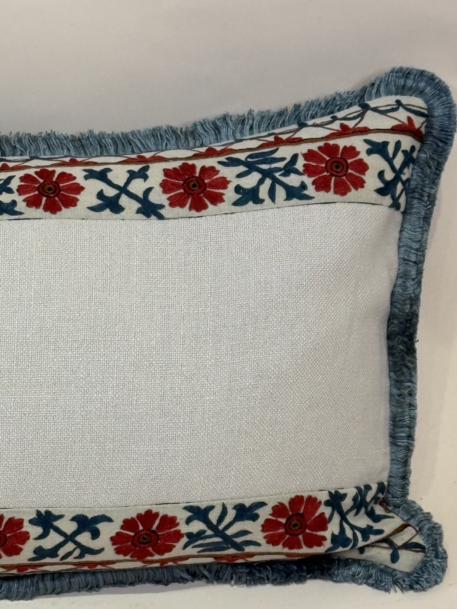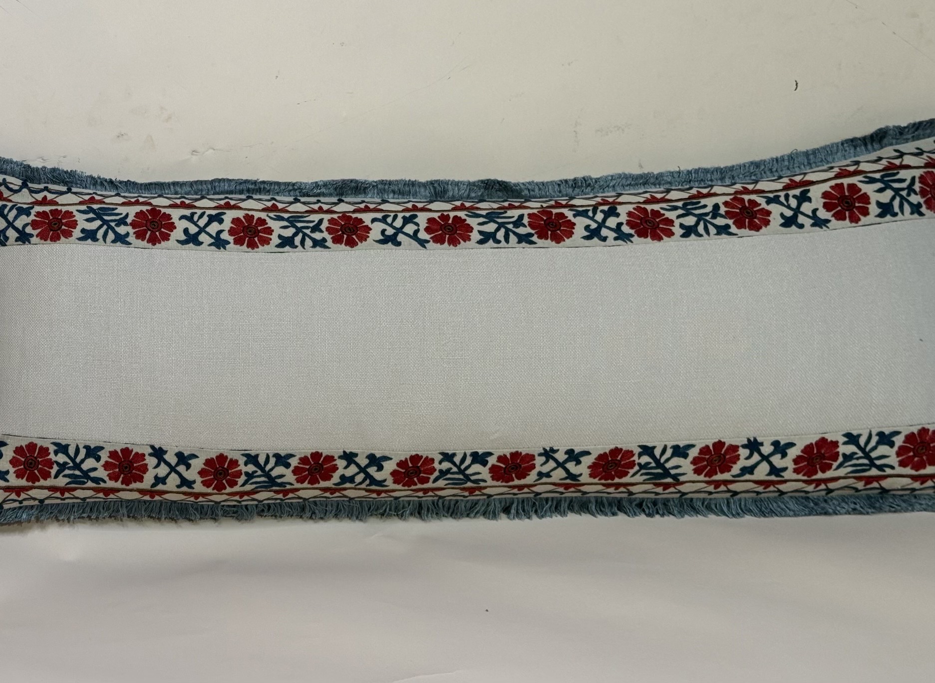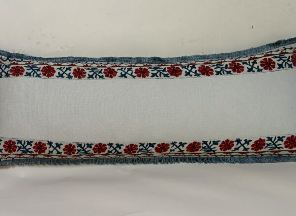A Lovely Long Embroidered Bed Cushion in the Ottoman Style, Mid 20th Century, with later cut ruche trim