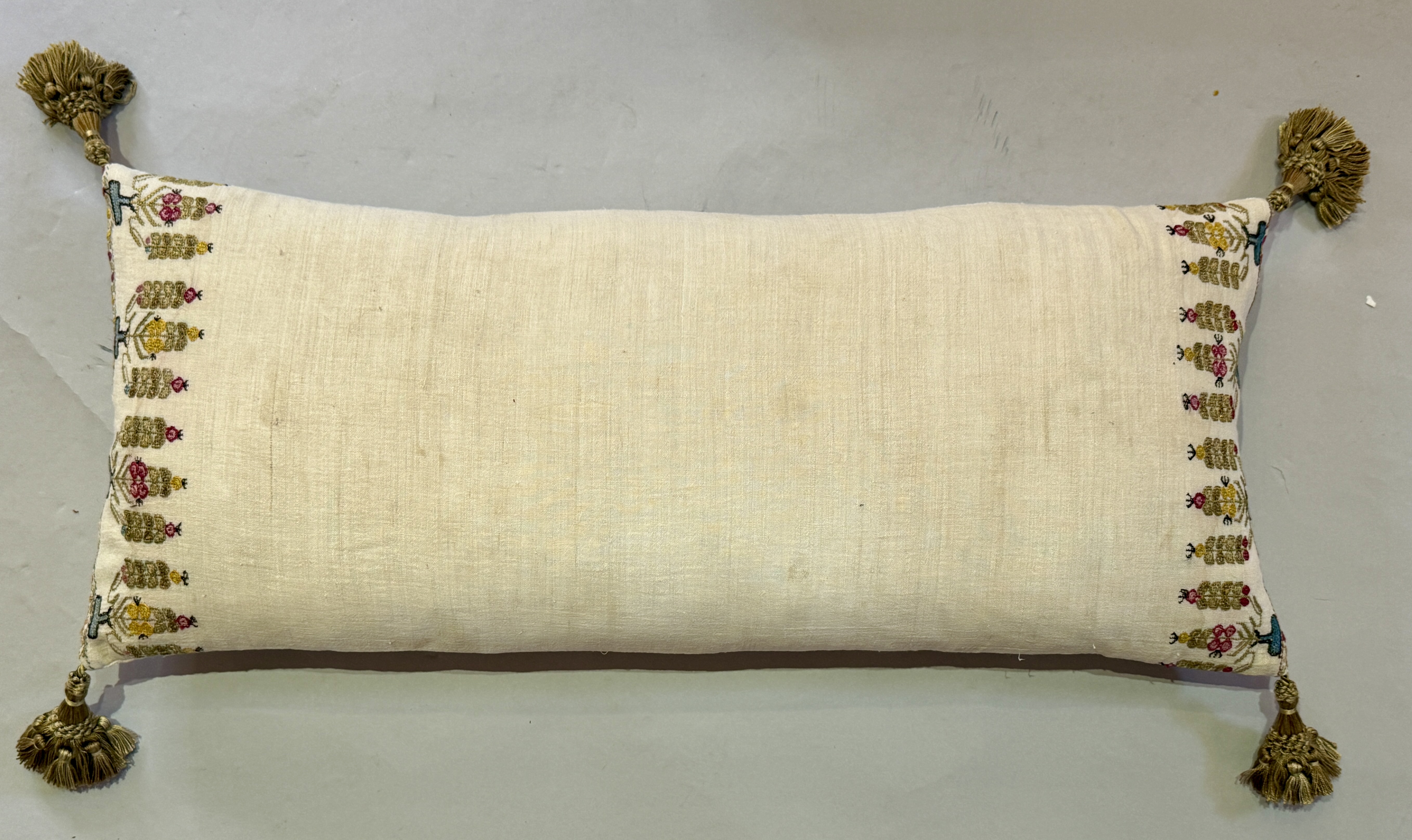 A Lovely Ottoman Embroidered Cushion, Made From an Ottoman Towel on Original Linen Background With Later Tassels to each corner