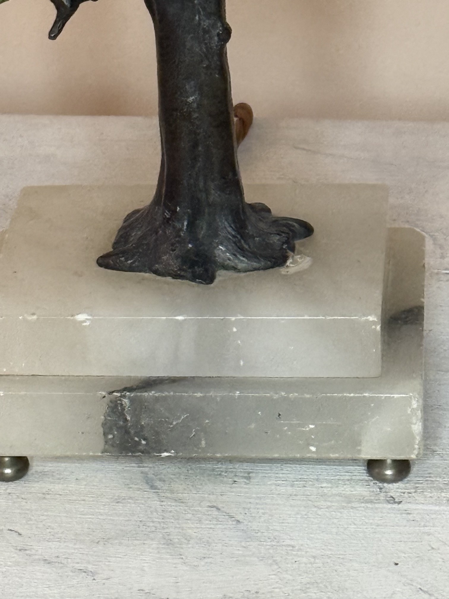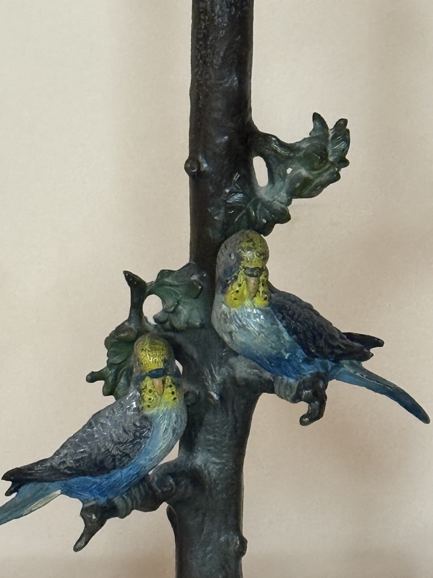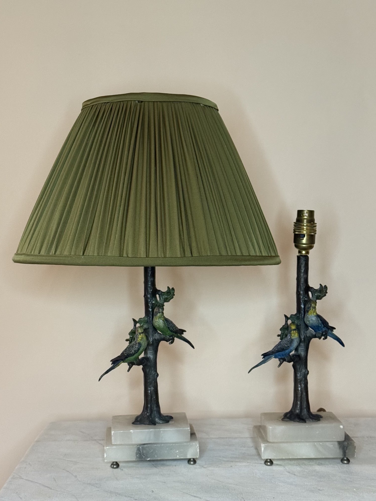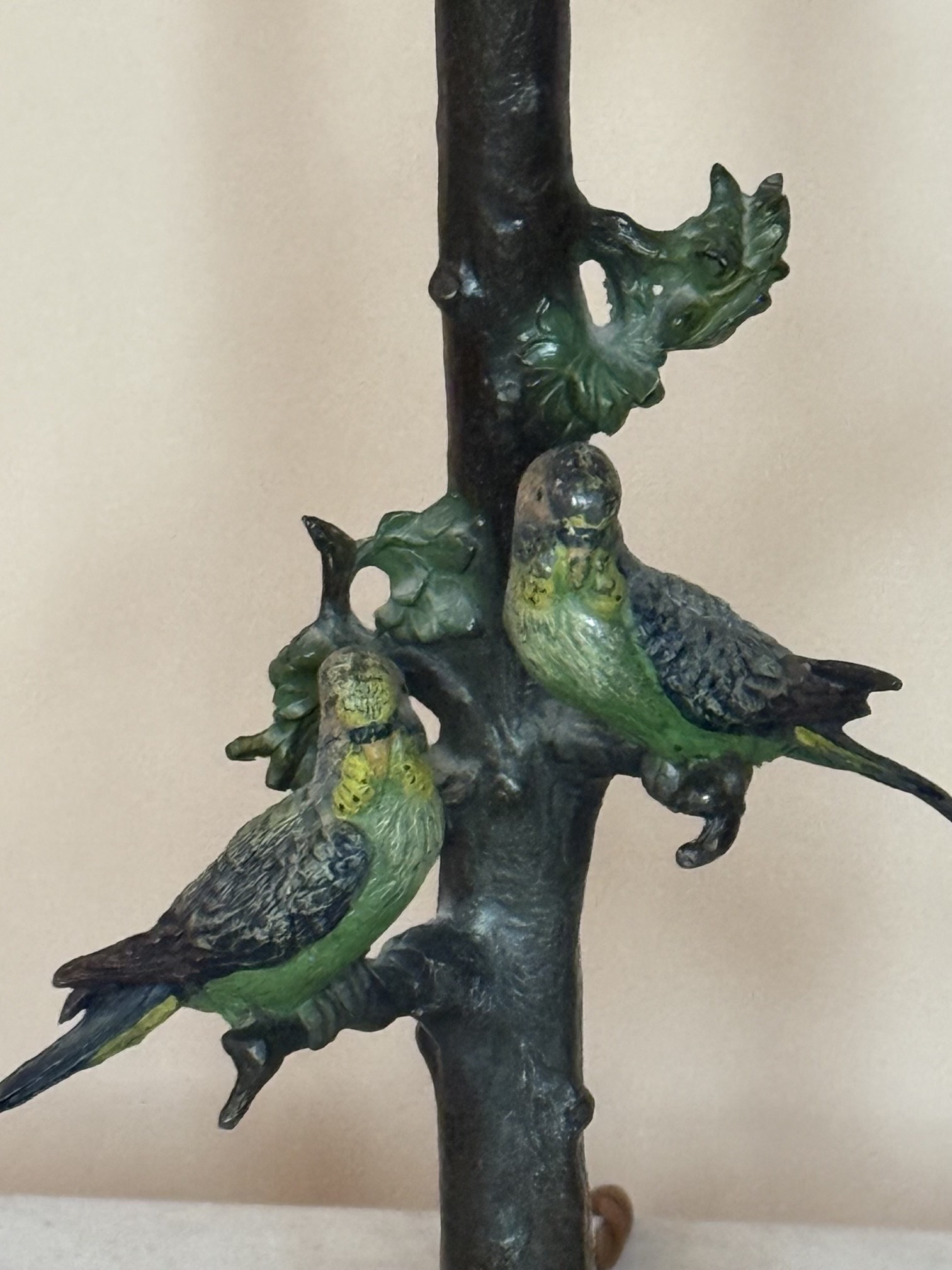 A Wonderful Pair of Small Austrian Cold Painted Bronze Bird Lamps on Marble/Alabaster Bases, Early 20th Century, With Pairs of Paraquets on Naturalised Branches
