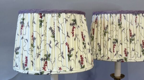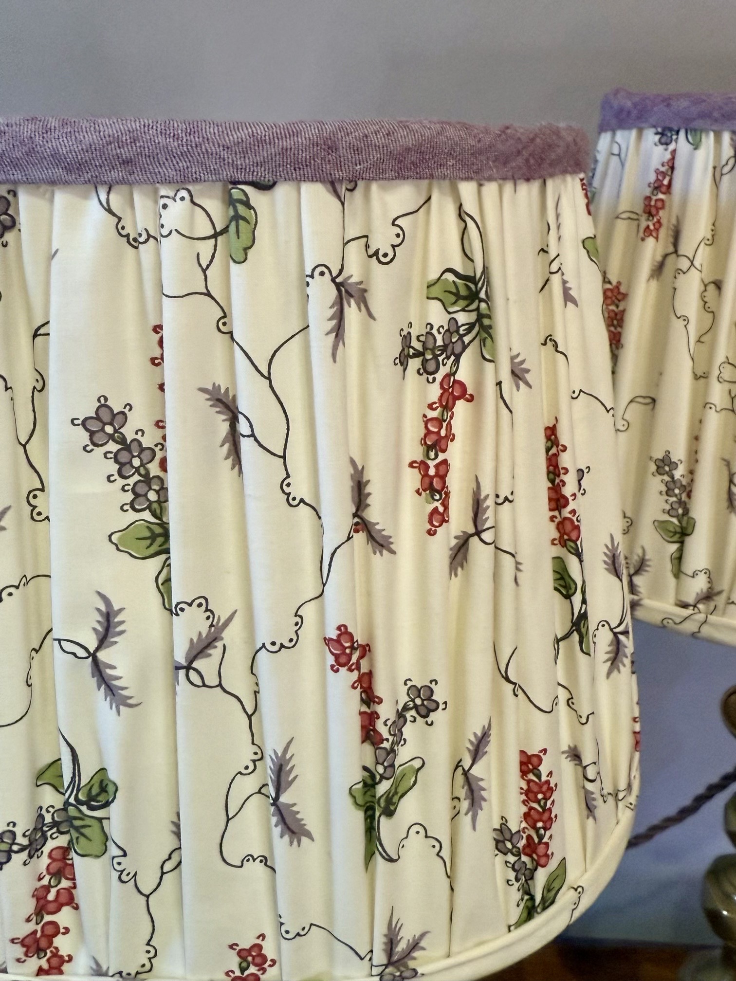 A Pair of Very Pretty Small Oval Gathered Lampshades in Fleurons d’Helene Fabric with Pale lilac trim to top and gimbal fittings