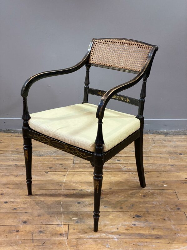 A Lovely Regency Painted Open Armchair, English, Early 19th Century, with Painted Front and Back Rail and Painted Legs, cane seat and partial back.