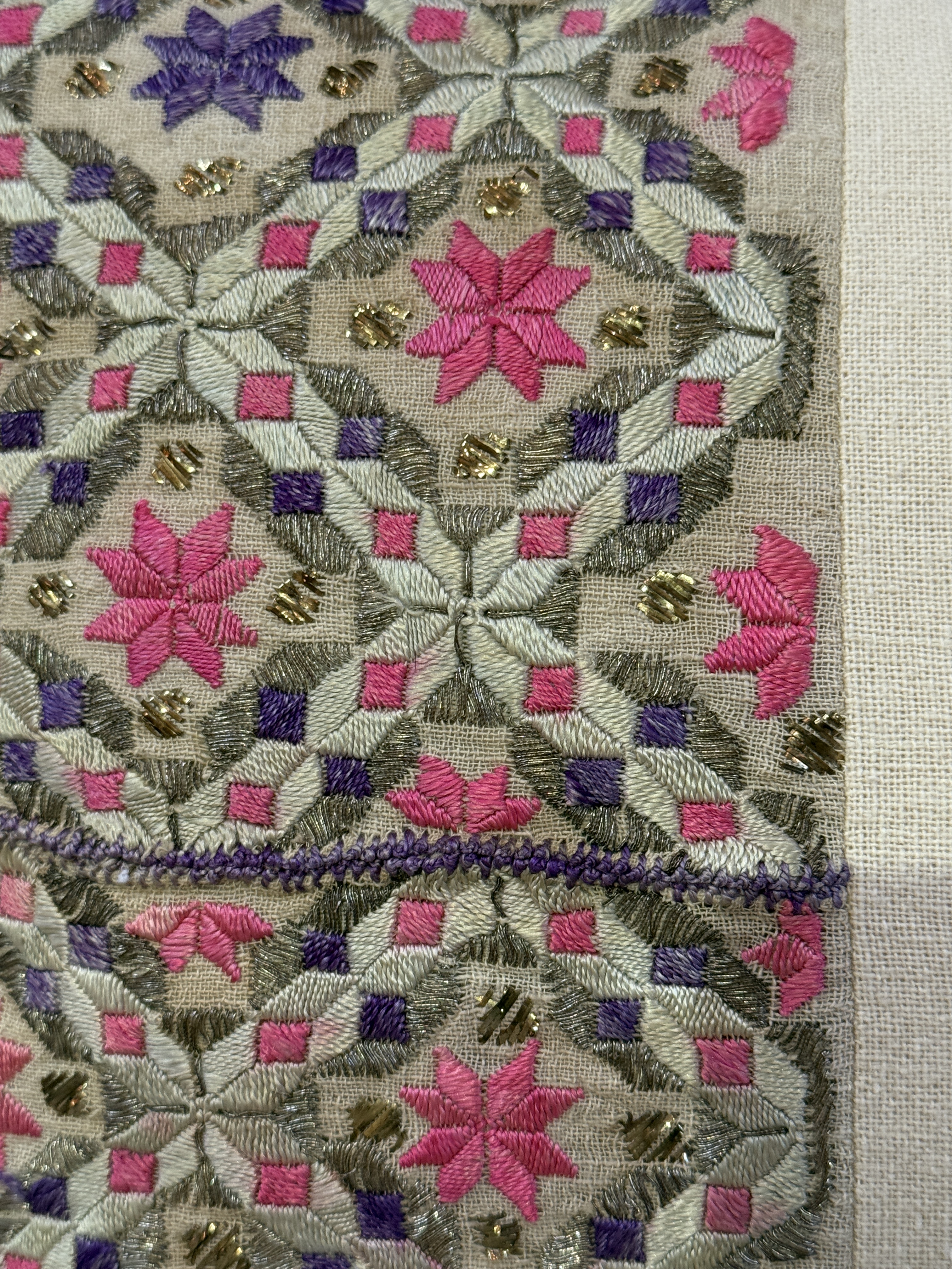 A Small Very Pretty Embroidered Ottoman Cushion, Early 20th Century With Later Linen Backing and Tassels to Each Corner.