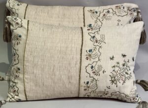A Very Pretty Pair of Ottoman Embroidered Cushions Made From Antique Towels, With Later Cut Ruche Trimming.