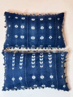 A Lovely Pair of Indigo Mud Cloth, Tie Dyed Cushions, Africa, 20th Century, with later Tassel Fringe
