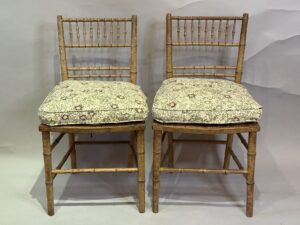 A Very Nice Pair of Faux Bamboo Beechwood Rush Seated Chairs, English, 19th Century, with Box Seat Cushions Made from a Le Manach Fabric by Pierre Frey