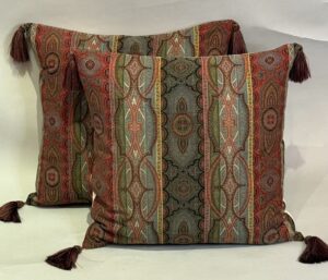 A Lovely Pair of Square Paisley Cushions Made From a Kashmiri Wool Shawl, Late 19th Century, with later tassels to each corner and cream linen to reverse