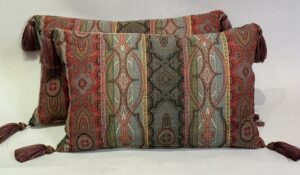 A Lovely Pair of Rectangular Paisley Cushions Made From A Kashmiri Wool Shawl, Late 19th Century, with later tassels to each corner and cream linen reverse