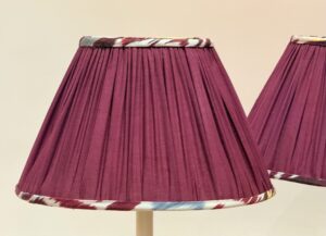 A Lovely Pair of Gathered Cotton Lampshades with Frill Made From Robert Kime Lining Fabric with Dark Aubergine Cotton Contrast Binding to Tops