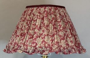 A Lovely Large Indian Red Block Printed Cotton Lampshade with Frill, Empire Shape, Duplex Fitting, Contrast Binding to Top