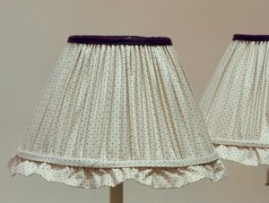A Lovely Pair of Gathered Cotton Lampshades with Frill Made From Robert Kime Lining Fabric with Dark Aubergine Cotton Contrast Binding to Tops