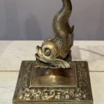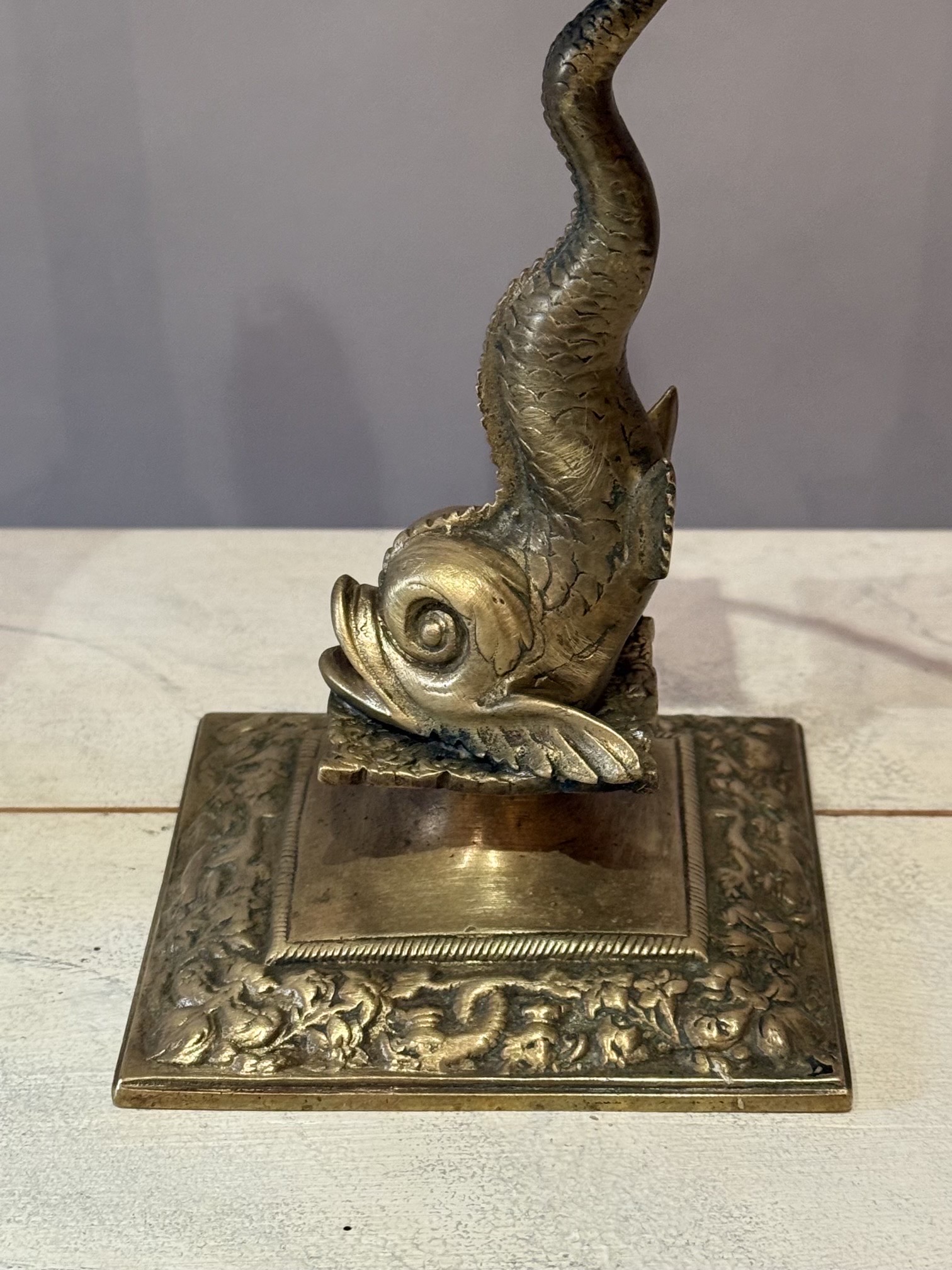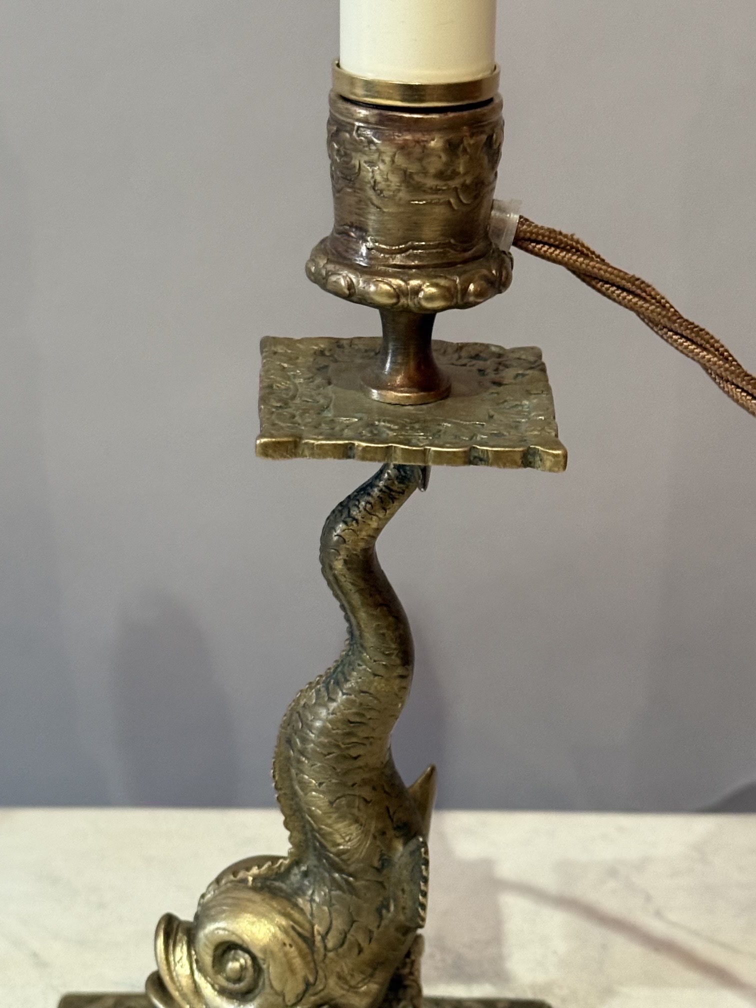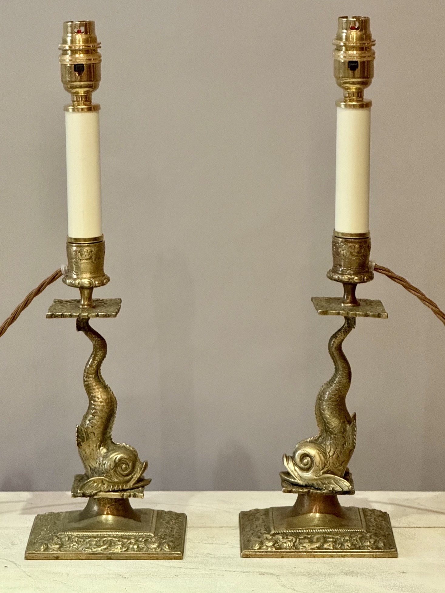 A Lovely Pair of English Brass Dolphin Candlesticks Converted to Lamps, Late 19th Century