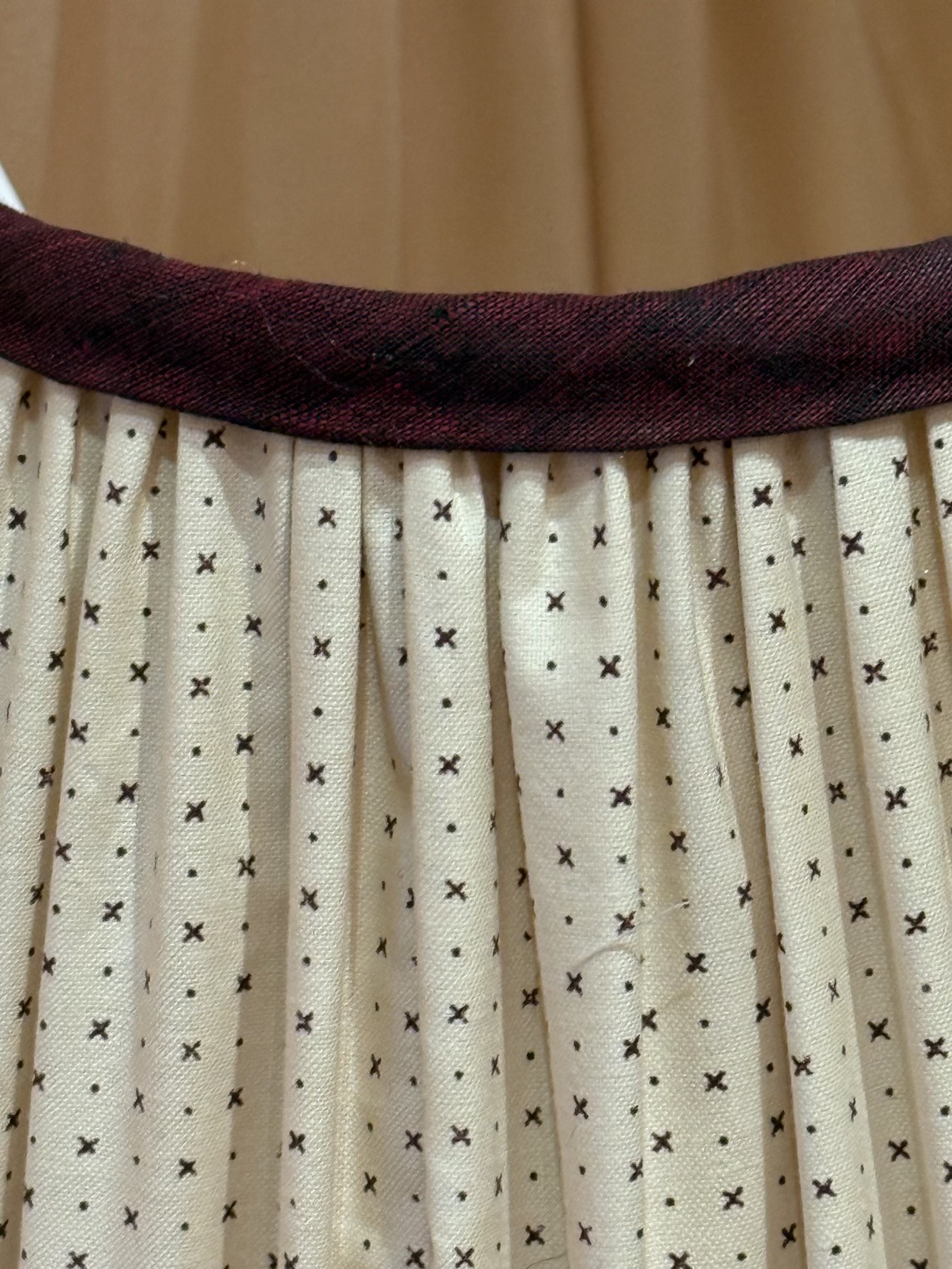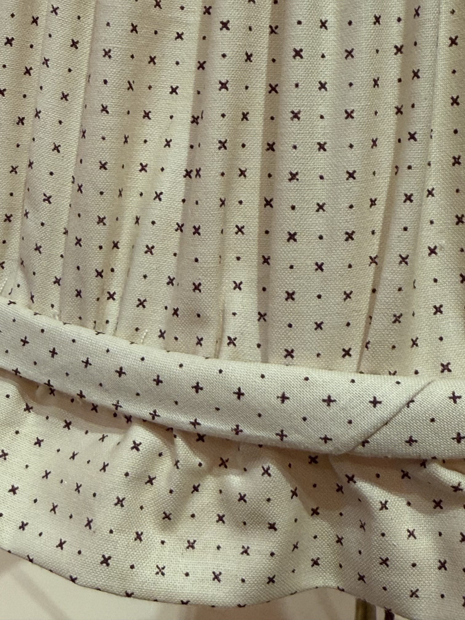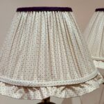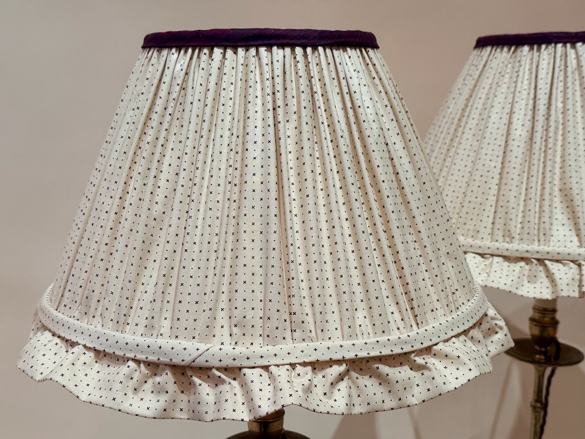 A Lovely Pair of Gathered Cotton Lampshades with Frill Made From Robert Kime Lining Fabric with Dark Aubergine Cotton Contrast Binding to Tops