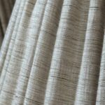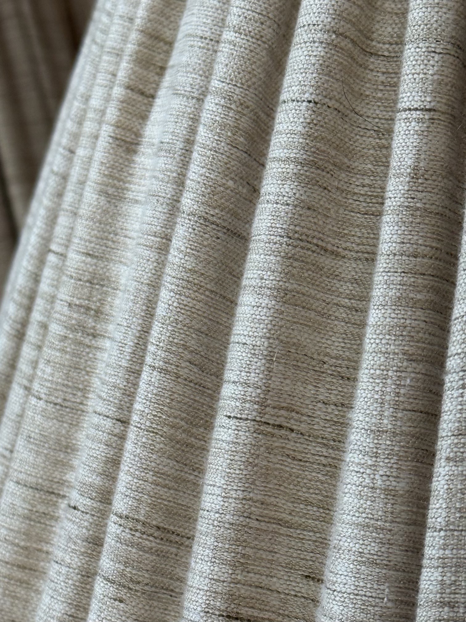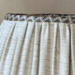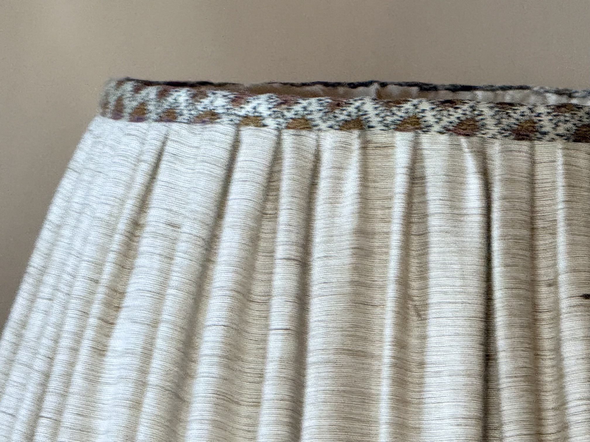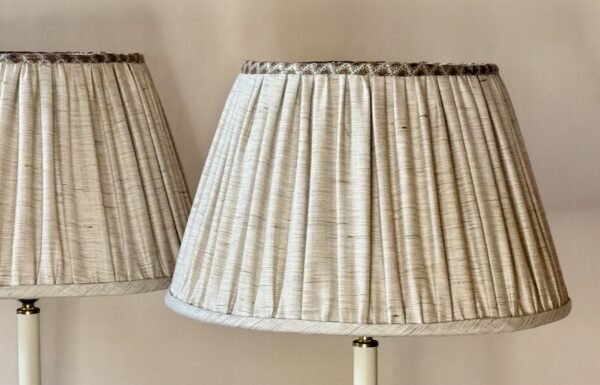 A Lovely Pair of Raw Silk Buff Coloured Gathered Lampshades with Antique Printed Silk Contrast Trim to Top Edge.