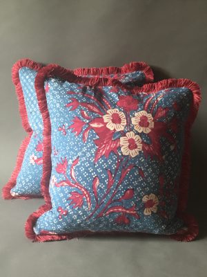 A Striking Pair of Blue & Dark Pink Cushions, Made from an Antique Indonesian Batik Fabric with later addition of Dark Pink Fringing. Java, Indonesia. Early 20th Century.
