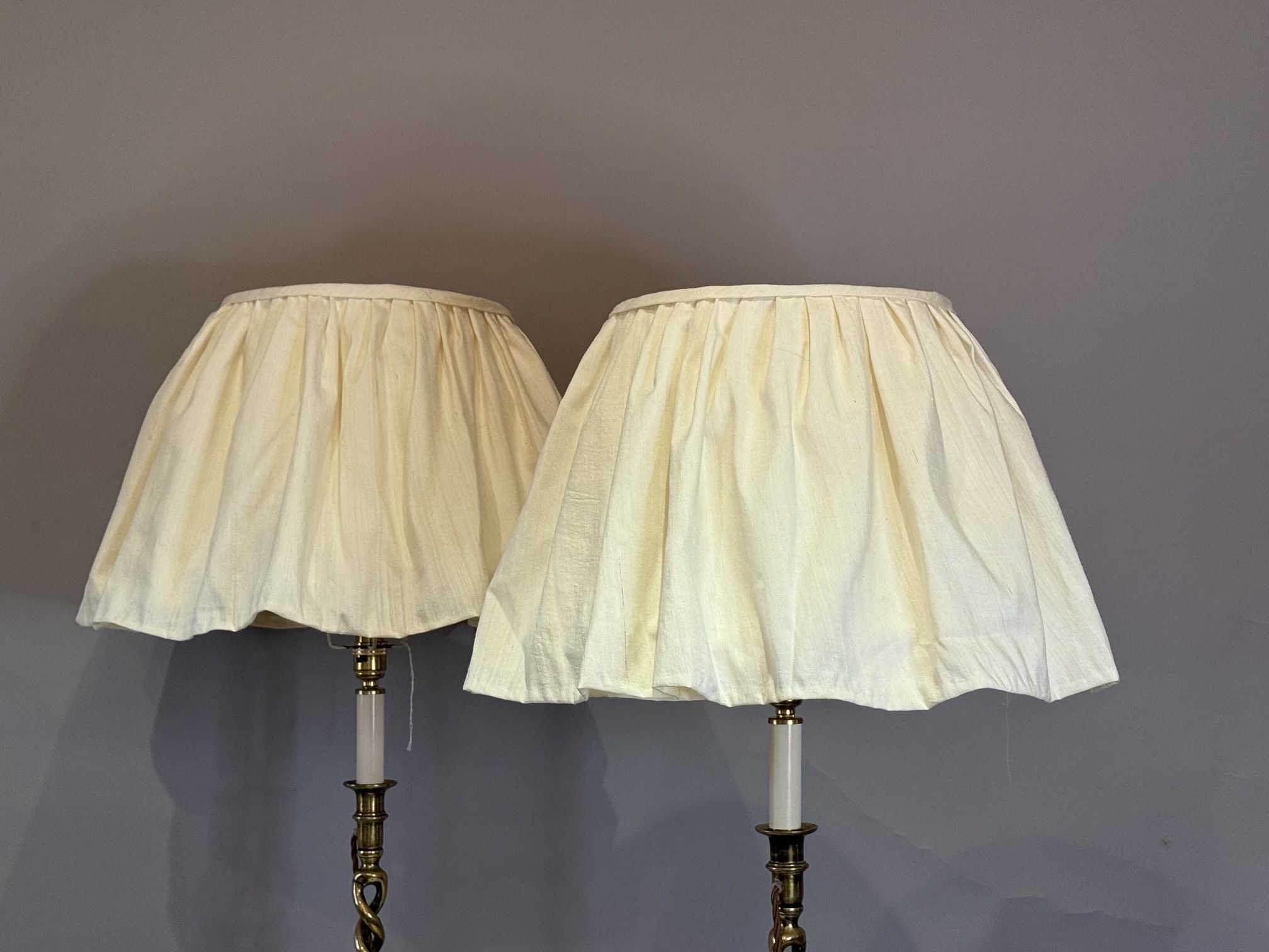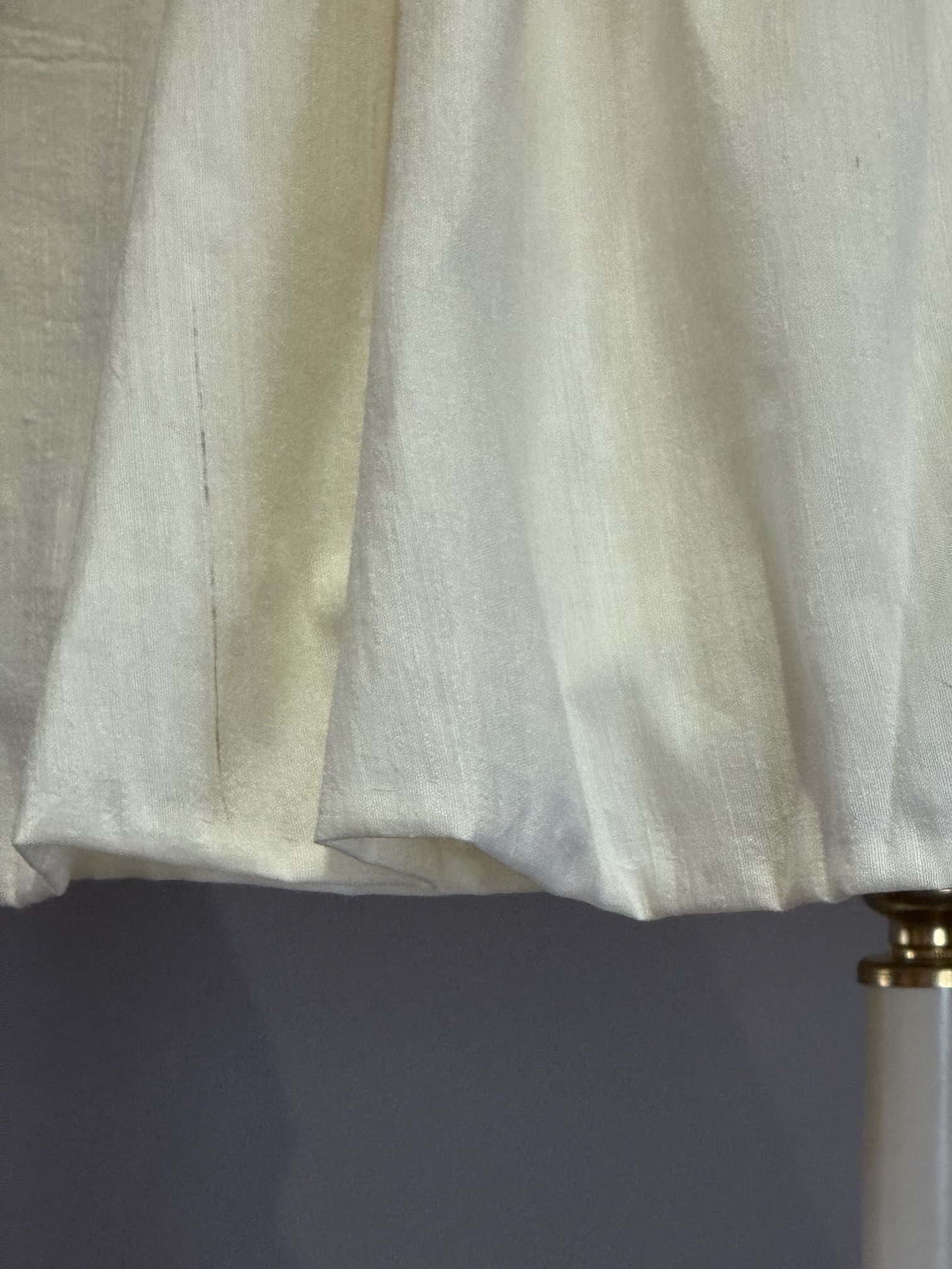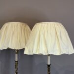 A Lovely Pair of Large Cream Silk Loose Skirted Softly Gathered Lampshades with Cotton Voile Linings, Duplex Fittings